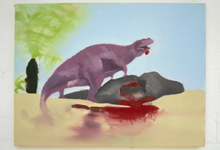 oil paint has been reflected since the Renaissance in its subject matter � our national galleries overflowing with fleshy nudes and overabundant arrangements of food. What we find in Brogan�s work is this sensuality escaped from its external reflection and embodied by its own stuff, but now with the fetishistic quality of shiny plastic attracting the light to its folds and creases: a narcissistic reflection. Unlike vinyl fetish-wear, however, Brogan�s objects appear squishy, as if too physical a contact would not leave one unmarked by the work�s juice, protected within its skin. In this respect the pleasure here seems oral and anal, rather than phallic � an idiotic infant joy. The ironically glossy pastel is like a garish cartoon of gooey food and bodily fluid; shit the colour of baby food out of a blender, fetishized and hung in a gallery.