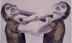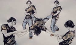 | | | The primary genre is self-portraiture, however, I see myself merely as a performer in these drawings. I am playing a passive role, like the artwork itself, vulnerable to the critique of an anonymous audience. I am not seeking a solution to relieve the tension in each drawing; on the contrary, I am deliberately placing myself in a position susceptible to the harm inflicted by a judgments from the both Innenwelt and Umwelt. I become an art critic before the artwork is complete, empowered to speak and authorized to silence what is not yet said. Unlike the paintings prior to 2011, I am no longer hiding behind a detached veil of abstraction, instead I am revealing my insecurities, my faults, my fears, and myself in an honest representation. In these drawings the brush marks, drips, and washes become my body - I become the art.