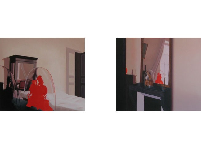 Paintings shown here (images 1-6) deal with spaces created by mirrors, which propose anomalies around reflectivity, transparency and opacity; and with internal repetitions and thresholds, which heighten a sense of looking and having that gaze returned, or deferred. Some multiply perceptions of space, mingled with feelings of both familiarity and displacement. As depictions of mirrors, they would reach out to include suggestions about the space the viewer occupies. Images 7-12 show paintings from a series concerned with wrapped commodities which can be bought in London’s East End: cheap wholesale fashion from Whitechapel, and bouquets of flowers from Columbia Road flower market. Painted in a monochrome orange, a mixture of magenta and lemon, constituent colours of the photographic process, their cellophane wrappings reflect and capture surrounding light, both offering and withholding their contents. The space of a bouquet, has its own fragile architecture, a vortex of flowers and foliage trapped in cellophane, just as massed clothing is both voluminous and collapsible. The paintings present this space as collapsed, yet virtual, a skin upon a surface. This image as a ‘skin’ may recall the retinal after image, or early photography, such as the salt prints of Fox Talbot, or early colour positives.
