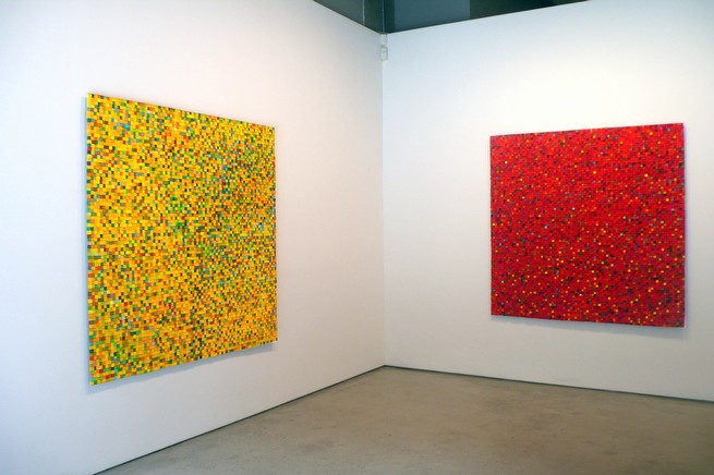 Carlos Estrada-Vega paints monochrome paintings arranged into large compositions. Each individual painting is not as important to Estrada-Vega as the labor of producing a large composition. Although finished and hung individually, each painting is only a part of a larger composition, much larger than the piece itself. Each piece is a hand made object: canvas stretched on wood; with colors mixed from pigments and mediums. Estrada-Vega's work is labor-intensive, repetitive and limited by the borders of the square. The process requires discipline. Color combinations are arranged by intuition, random selection and his own personal taste.