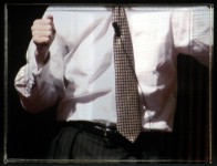 Meticulously housed in the suitcase is Frederick’s recent body of work entitled ‘Corporate Casual.’ Taken from his “other“ life as an employee of a major monetary institution, it consists of surprisingly intimate photographs of the corporate environment made into paperweights. Also represented are various ephemera from Frederick’s own corporation, a nameless entity perhaps best illustrated by its faceless nametags and engraved pens featuring his attractive, familiar, yet ultimately meaningless logo. A quick glance at these elements (both the performance and the series) might tempt one to simplify the project as a straightforward critique on the commodification of art or an easy jab at the lack of identity in the corporate world. These elements are no doubt present but upon closer inspection this project becomes more compelling; Frederick’s undertakings are personal acts of subversion awkwardly positioned between the two worlds that he is dependant upon. This project is a complex blend of wish-fulfillment and self-denial, role playing and deceit; it is a risky endeavor and an insightful look into the relationship of art and business.
