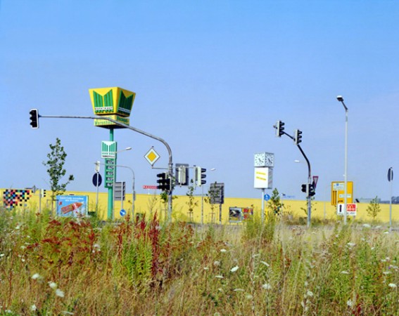 Edith Roux (born in Paris, 1963) analyses with photography contemporary landscapes in what they reveal on the evolution of urbanization and our environment. EUROLAND* – Indefinite zones with no particular qualities are created between cities and the surrounding countryside. Scenery consists of shopping centres built along motorways, dual-carriageways, ring roads and intersections; of roads lined with billboards; and of soulless, all-purpose buildings.