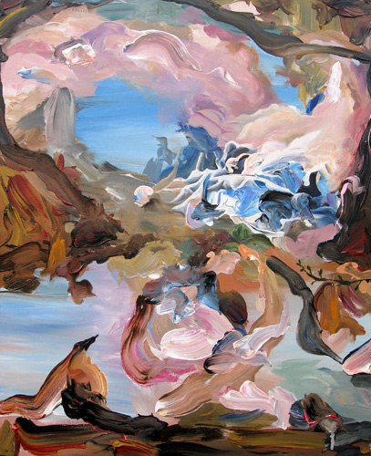 Are these turbulent sketches or pastiches on the works of Italian decorators of the sixteenth and seventeenth centuries who dignified vast interiors with religious and secular allegories? Of course not: and yet, like resonance imaging, we are teased by these gestural flurries of pigment and hints at resemblance that might be - an ersatz Titian chariot, a proxy Correggio angel, a Michelangesque limb, a swirling Veronesan drape. Now you see them... oh! no you don’t!