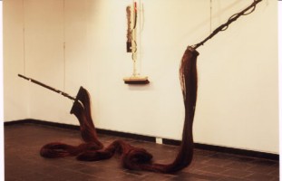 ABOVE IMAGE : – Barometric Distillation No. 2 – (Eucalypermian) Medium : Coal (Wakkerstroom lossopteridales), blue gum leaves (Eucalyptus Globulus Myrtaceae), vaseline, vinegar, perspex, bronze, resin, zinc-plated steel and steel riggings. 2003. Dimensions: (H) 3000mm x (W) 400mm x (D) 300mm. – – – RIGHT IMAGE – Suspended Sentence (part 1and 2) – Medium : Brooms, shamboks, perspex, resin, steel, vinegar, Port Jackson Willow (Acacia Cyclops) and coal (Wakkerstroom Glossopteridales) 2003. Dimensions: Of whole installation: (L) 7m x (H) 2.7m x (D) 2.5 m