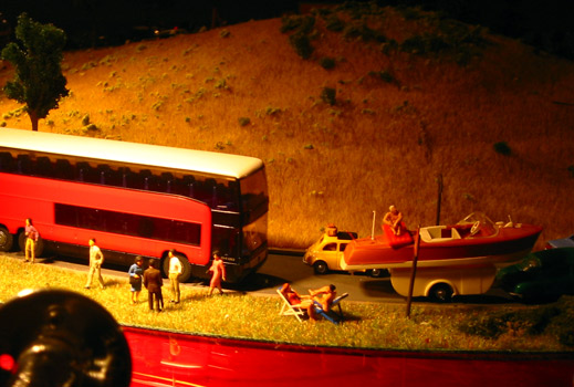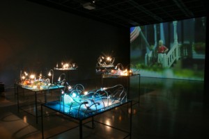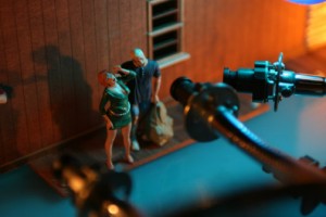 Entering the gallery, the viewer sees seven platforms each containing a tiny fragmentary film set. The platforms each embody images and sounds from a particular cinematic genre (the eighties slasher, the fifties melodrama, the sixties art film, etc). The platform/genres can each stand autonomously or together they produce a cinema-hopping amalgamation of themes and eras. Over 50 miniature video cameras and lights are suspended over the sets, creating a new filmic entity generated live. By exposing the film sets together with their film, the McCoys expose and yet retain the magic of movie-making. We can see the working parts of the apparatus, but are still won over by the whole. The sets themselves are an exploded spatial view of what one experiences temporally in film. The images are shot by several cameras simultaneously, each from its own angle, each focused on a different area of the set, and the multipart compound of images that these cameras together create is then sent to a computer running custom software that picks from the range of choices, “editing” it into the seven movies. | The McCoys handle the passage of time by spreading “actors” and locations out in space to represent different moments, which are then intercut onscreen to suggest movement in time and place. Each story is told in six to ten shots. “A magical shift occurs: the instantaneous translation of a physical space distributed over a large horizontal field, in which everything exists simultaneously and three-dimensionally but without movement, into a flat visual space on a vertical screen, in which nothing has any physical depth and in which physical simultaneity is converted into temporal sequence and action…The McCoys' new piece “Soft Rains”, intricate and entertaining, is rooted in the history of film, which, however, with slice-and-dice aplomb, it chops into a new form: its cinematic syntax is parsed not by any familiar story-telling ambition but by the electronic synapses of the computer.”DAVID FRAENKEL from catalog essay for the 'Soft Rains' exhibition at Sala Rekalde in Bilbao.
