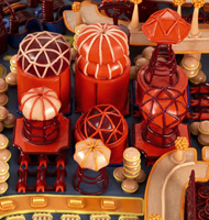 My artmaking revolves around the power of miniatureforms to act as symbolic landscapes. Influenced by theheightened ornamentation of Middle Eastern craft, Irevel in the seductive beauty and power of detail, andits potential to create metaphoric and poetic meaning. I construct hundreds of handcrafted sculptures thatsuperficially resemble everyday objects such as jewelry or candy, but trigger a wide range of associations, both personal and cultural. The hierarchical arrangements of these miniatures suggests architectural models of public plazas, but their petitscale and unheroic forms subtly mock the notion of monumental sculpture.
