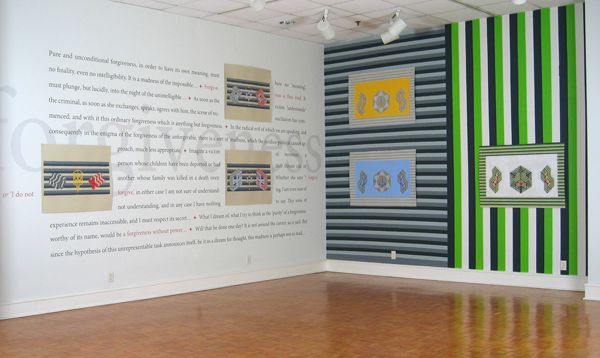 "On Forgiveness" 2006 - an installation involving wall text, wall painting, drawings on paper and video. The wall text is excerpted from an essay by Jacques Derrida entitled "On Forgiveness." The drawings involve iconography from three aspects of contemporary Jewish identity, the Holocaust, Zionism and the Israeli/Palestinian conflict.