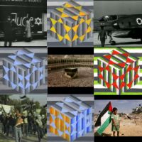 A composite of video stills from a video shown with "On Forgiveness" 4:07 min. animation and archive footage.