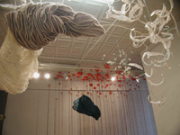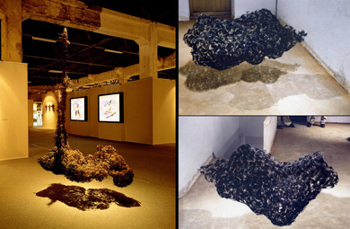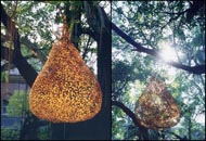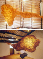 In 1998, I started a series of work named Clothes of Consciousness. Within six years, two of four pieces in the series made are the quite same in shape like a real mushroom cloud, but different in position. The whole idea is inspired into my early work, Doubt, Existence, Mushroom Cloud, to develop the different aspects in such an idea. Innocence Temple is a romantic ceremony in memory of childhood; Clothes of Consciousness series are my observations to the status of mankind¡¦s existence. Each piece of the Clothes of Consciousness is as flying as floating souls in the air, cells-like structures, briar-like in tangling, and suffering from linking. The structure of Clothes of Consciousness implies the conception of ¡¥unfinished.¡¦ They could be deconstructed in transforming or in weaving the live intensely. |