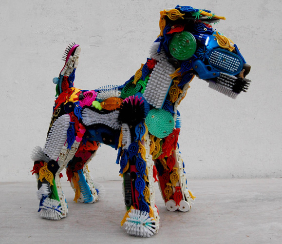 For a long time now I have preferred to use materials that are not bland i.e. have some kind of history of weathering or use. One day about four years ago out in the studio I was looking into my childrens box of outgrown / discarded toys which happened to be stored in the same building and responded to the random collection of colours shapes and forms they made. I figured that if I could find a way of putting them together to constitute a larger form they would have great potential as larger scale sculpture. Over the next while I experimented with two other construction methods (which both had their downsides) - before one day about a year ago in frustration I tried putting a screw through one toy and then many others. To my surprise most didn�t crack or shatter and the new series has been largely based around and developed from that fact. Ideally the pieces will work on many levels. The toys themselves interest me in their own right as mini sculptures by unknown and uncredited artists. Mostly I use the toys abstractly as forms with which to build muscle bone or internal or external organs but all types of human pursuits can be referred to and represented through them - things loved or hated - things used and carried as tools etc etc. They provide interest in surface detail whilst making their contribution to the totalities. The toys also provide a moving history of fads and fashions as they pass through the media and our awareness temporarily significant and then forgotten. Public reaction to the sculptures has been largely very positive (in some cases gleeful)- often children drag their parents to come and look at the pieces and then a whole sequence of recognition and recollection usually begins, naming the various toys and recalling the times and circumstances of their use. There is usually some fascination with the sculptures, the individual toys used and with the process of their acquisition and construction. Sometimes there is outright laughter. There is usually a whole process of going back and forth between looking at the sculptures as a totality and the individual parts from which they are made (which of course is my intention). Some people of course just say they are rubbish which of course is perfectly true! There is also often talk about consumerism waste and recycling, which whilst not being my central concern is also in my view positive when it occurs. Some find the sculptures beautiful/ curious/ scary/ weird/ emotional and etc. (which considering all they are really are , is bits of what is usually seen as trash) is great. In a way the sculptures are also history pieces in the sense that you could date any one of them roughly speaking from the time that the last toy screwed on to the structure was produced.