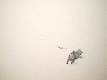 Left image and image below – Fire! – graphite on the wall, 2002 dimension variable. – A scene of troops shooting a missile is drawn by graphite directly on the wall of the gallery. The realistic drawings transform the white wall into a huge pictorial space however, the emptyness of the background rejects the picturization and neutralizes the act of violence at the same time.