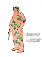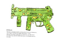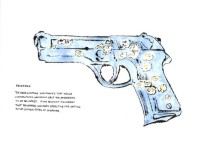 Right images – Herbal Guns, – ink and watercolor on paper, 2002, 9 x 12 in. – The sophisticated design of modern guns shows the cruelty of human beings, while herbal flowers inlaid within the guns and its descriptions tell the medicinal virtues. Two contradictory features, artifacts for killing living things and creations of the natural world used to heal people, are combined into one. A protest against violence is represented by joyful watercolor and ink.