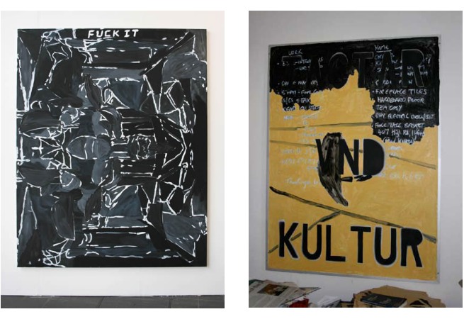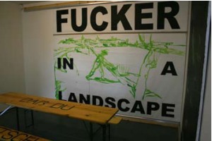 As we enter the main space, what appears, at first, to be a bizarre grouping of pseudo-modernist paintings, soon turn out to be the slacker musings of Ellis as he mixes purposefully dumb sentence construction with deconstructions of Picasso and Goya. These are again on sliders that turn the oversized paintings into doors or give them the option of somewhere to go, but too little room to move. This sounds like a clumsy metaphor for the many dead ends of painting, but in Klever Strasse, dumb is Klever, and if you are in any doubt as to how to wear your hang ups, Ellis has installed a German Beer Tisch for the audience to sit and contemplate, Tr�s Pass�, Fucker in a Landscape, The Lazy Thieving Cunt and of course, Fuck It.