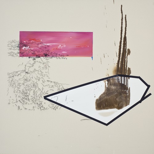 Cette transmutation opère dans les deux sens lorsque ces fluides arborescences sont confrontées au tracé net de projections de photo serres, décalqué d’un geste stylisé qui les tire de la référentialité vers l’abstrait, dans les deux tableaux désignés Untitled (landscape). Elles s’y frottent egalement, comme dans The Garden, à des polygons monochromes parfois déhanchés vers l’oglique, rappelant ceux qui peuplent l’espace transcendental immaculé du suprématisme et du constructivisme, mais subvertis ici par des moirures, des brèches ou du ruban de masquage soulignant à gros traits leur matérialité artisanale.