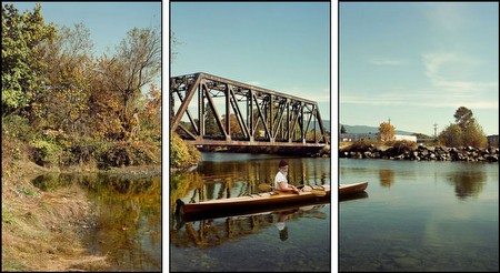 Rodney Graham, Paddler, Mouth of the Seymour, 2012-2013 Three painted aluminum lightboxes with transmounted chromogenic transparencies 119 5/8 x 71 5/8 inches each panel, 119 5/8 x 216 5/8 inches overall, edition of 4 | |||