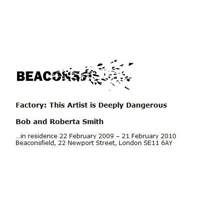 | Factory: This Artist is Deeply Dangerous Bob and Roberta Smith �in residence 22 February 2009 � 21 February 2010 Beaconsfield, 22 Newport Street, London SE11 6AY As recession bites, Bob & Roberta Smith are making the most of the spacious Beaconsfield premises, turning the former Ragged School into a prolific site of production for one whole year. Beaconsfield is currently inviting the public to view Bob and Roberta Smith's work in progress 'This Artist is Deeply Dangerous'. The work takes inspiration from Tennis Correspondent of the Guardian, Steve Bierley's remarkable article on the artist Louise Bourgeois. This 11 meter long work is the most complex painting Bob and Roberta Smith has done to date. People can see Bob and Roberta Smith working on the painting in Gallery 1 until August, when it will travel to the Edinburgh Festival. The painting will then return to Beaconsfield to be shown in Bob�s Factory Outlet exhibition in Autumn 2009. Bob says �The work could be called 'One Song to the Tune of Another', let me explain, in the manner of the popular Radio 4 programme 'I'm sorry I haven't a clue', last summer, the Guardian sent its Arts writers to review sports events and its sports writers to review Art events. Among the results was this amazingly frank analysis of the differences between art and sport by tennis correspondent Steve Bierley. Oddly one visitor to Beaconsfield last week was Jeremy Hardy who once sang Teenage Kicks to the tune of Jerusalem during an edition of 'I am sorry I haven't a clue.'� Bob and Roberta Smith believe the activity of art is the important thing. Art is not simply about objects or Artists. �There should be no Artists, just people making art.� This is the first in the Beaconsfield series Phase, which turns the spotlight on mid-career artists with whom the organisation has had a significant past relationship. Beaconsfield Commissions 2009 Beaconsfield offers a space for artists and audiences to experience high quality ('beacon'), challenging, new art works in a wide range ('field') of contemporary visual art media through commissions, group exhibitions, performances, publications and events. | ||||