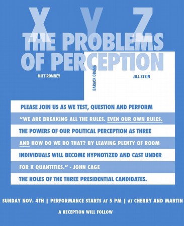 | X Y Z : The Problems of Perception Please join us this Sunday, November 4th, as we test, question and perform the powers of our political perception as three individuals will become hypnotized and cast under the roles of the three presidental candidates. "We are breaking all the rule. Even our own rules. And how do we do that? By leaving plenty of room for X quantities." - John Cage Performance starts at 5 PM A reception will follow. For more information please contact [email protected] | ||||