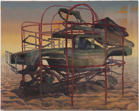 | DANIEL DOVE January 16 - February 20, 2010 Cherry and Martin presents its second solo exhibition of Daniel Dove�s large-scale oil paintings dealing with pictorial construction and the manipulated environments of contemporary America. Daniel Dove�s recent paintings depict structures in states of transition, either half-ruined or partially reconstructed. The subjects of Dove�s pictures range from suburban landscape detritus to charged contemporary artifacts (such as reconstructed bombed airplane fuselages), meticulously re-built to understand or reinvent their original trauma. In this rebuilding, Dove�s objects reveal a longing for completeness that can never be restored, much the way that his highly composed canvases offer distilled, ordered fictions based on chaotic and often dangerous real-world events. Daniel Dove�s process combines naturalistic depiction with reflexive aspects that refer to image-making and/or painting. This could be emphasis on painting�s material (gesture and other process evidence), reference to genres of abstraction (all-over, geometric), or the idea of an image within the image that doubles the picture plane (such as a billboard, stage flat, or movie set). By working multiple concerns within each work, Dove�s paintings echo the re-assembled or staged aspects of his subjects, where unity is always both present and tenuous. This balance of depictive and reflexive ambitions makes both narratives�that of studio thinking and that of the world external to art�equally important in Dove�s work. Daniel Dove received his MFA from Yale University. His work has been featured in such exhibitions as Fracture and Fidelity, curated by Chris Bedford, at RISD (Providence, RI); Made in California at the Frederick R. Wesiman Museum of Art (Malibu, CA); and Dreaming of a More Better Future, curated by Saul Ostrow, at the Cleveland Art Institute (Cleveland, OH). | ||||