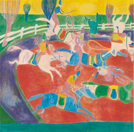 | Contemporary Fine Arts freut sich, eine Einzelausstellung mit Tal R (*1967) bekannt geben zu d�rfen. Der als Tal Rosenzweig in Tel Aviv geborene d�nische K�nstler zeigt zehn neue Arbeiten auf Leinwand. In der neuen Werkgruppe vollzieht sich ein radikaler Bruch mit Tal Rs vorheriger Technik. Der K�nstler geht von der oft pastos aufgetragenen �lmalerie �ber zu einer f�r ihn �berraschenden neuen Technik. Hasenleim und Pigmente werden gemischt und unmittelbar auf die ungrundierte Leinwand aufgetragen, wodurch ein matter Oberfl�cheneffekt, �hnlich dem Effekt eines Freskos entsteht. Auf einigen Arbeiten zeichnet der K�nstler anschlie�end mit Wachskreide auf die bemalte Oberfl�che. Nach eigenem Bekunden �hnelt Tal Rs Malerei einem Feuertopf, in den er �alle Arten von Material� hineinwirft. Dabei zeugen seine farbkr�ftigen Gem�lde nicht nur vom Einfluss der Subkultur und der uns und ihn t�glich umgebenden Bilder des Alltags wie Filme, Musik, Graffiti oder etwa die Wandmalerei einer Berliner 20er Jahre Bar wie in �We are the elephants�, sondern vereinen mit diesen auch Elemente der Hochkultur und der Kunstgeschichte. Die Gem�lde haben meist einen schematisierten Bildaufbau. Die Szenen und Geschichten ruhen auf einem breiten horizontalen Untergrund, der sich konstant durch Tal Rs Werk zieht. Die narrativen Bildinhalte werden durch den geschichteten Bildaufbau wie auf einer Art B�hne pr�sentiert. Ein r�umlich wirkender, theater�hnlicher Aufbau wie in �Night Tingel Tangel� sowie kulissenartige H�ngevorrichtungen wie in �Blind Date� oder die Zirkusszenerie in �Elephant behind clown through keyhole� unterstreichen diesen Effekt. Der Betrachter und der K�nstler selbst nehmen so eine Zuschauerrolle ein, die es ihnen erm�glicht, Einblicke in eine andere Welt zu gewinnen, sei es der Blick auf eine B�hne, durch ein Fenster mit Br�stung wie in �The Call� oder auch ein Schl�sselloch. Dies ist die siebte Einzelausstellung des von Contemporary Fine Arts exklusiv vertretenen K�nstlers. Tal R lebt und arbeitet in Kopenhagen. Contemporary Fine Arts is pleased to announce a solo show with TAL R. The Danish artist, who was born in 1967 as Tal Rosenzweig in Tel Aviv, is showing ten new works on canvas. The new group of works marks a radical break with Tal R�s previous technique. Whereas before, he often applied his oil paints in a pastose manner, he now mixes animal glue and pigments and applies this mixture directly to an unprimed canvas. This creates the effect of a slightly dull surface, reminiscent of a fresco. On some works, the artist then draws with wax crayons on the painted surface. According to the artist, his painting is like a hot pot into which he throws �all kinds of material.� His colourful paintings thus do not just reflect subcultural influences as well as images from everyday that surround us all, such as films, music, graffiti, or, for example, a fresco of a Berlin bar from the 1920s, like in We are the elephants, but they combine these with elements from high culture and art history. The paintings usually are structured rather schematically. The scenes and narratives rest on a broad horizontal underground which is a constant in Tal R�s oeuvre. Through the layered structure the narrative content is presented as if on a kind of stage. This effect is emphasized by the spatial composition reminiscent of a theatre, such as in Night Tingel Tangel and a suspension contraption for a backdrop, such as in Blind Date, or the circus scenery in Elephant behind clown through keyhole. The beholder and the artist himself take on the role of the audience, which enables them to gain insights into a different world, be that the view of a stage, through a window with a parapet, or a keyhole. This is the seventh solo show of works by Tal R, who is exclusively represented by Contemporary Fine Arts. Tal R lives and works in Copenhagen. | ||||