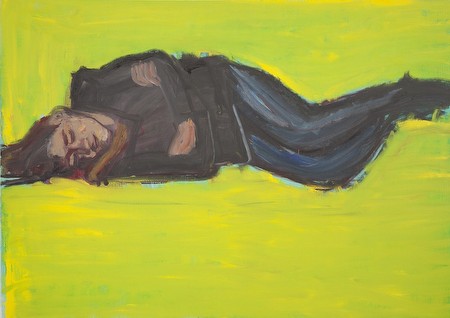 Damien Cabanes, Charlotte allong�e fond jaune, 2015 oil on canvas, 138 x 193 cm � Courtesy Galerie Eric Dupont, Paris. | |||