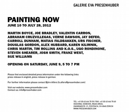 | PAINTING NOW MARTIN BOYCE, JOE BRADLEY, VALENTIN CARRON, ABRAHAM CRUZVILLEGAS, VERNE DAWSON, JAY DEFEO, CARROLL DUNHAM, MATIAS FALDBAKKEN, URS FISCHER, DOUGLAS GORDON, ALEX HUBBARD, KAREN KILIMNIK, CHRIS MARTIN, TIM ROLLINS AND K.O.S., UGO RONDINONE, STEVEN SHEARER, JOSH SMITH, FRANZ WEST, SUE WILLIAMS June 10 2012 - July 28 2012 As a sequel to last summer’s successful “Sculpture Now” exhibition, Galerie Eva Presenhuber is pleased to present the group show “Painting Now” featuring artistic positions that reflect current trends in painting. For further information please contact Björn Alfers or Florian Keller at Galerie Eva Presenhuber. Opening on Saturday, June 9, 5 to 7 pm. | ||||