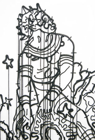 | Hew Locke 'The Nameless' 10 September - 17 October 2010 Private View: Thursday 9 September You walk through a series of arches, so to speak, and then, presently, at the end of a corridor, a door opens and you see backward through time and you feel the flow of time and realise you are only part of a great nameless procession. John Huston Hales Gallery is pleased to announce Hew Locke's third solo exhibition at the gallery. The Nameless presents a new grand scale installation, covering the gallery in dripping beads and cord. With reference to Huston's self-reflective quote, Locke's work displays a mysterious collection of an endless procession led by drummers enigmatically passing through the space on a seemingly endless journey. Both Locke's imagery and notion for the work are informed by a diverse and rigorously selected body of research. The Nameless sees a dense amalgamation of historical and contemporary references; Venetian sculptures rub up against Victorian architectural details, Pre-Columbian artefacts with Assyrian reliefs and the Benin bronzes. With reference to medieval frescos of the Last Judgement and of past battles and Egyptian tomb paintings, Locke revels in the past's use of narrative. However, The Nameless does not offer up clarity in its sequence of events, instead the work provides a false sense of didactic discussion where the pastiche of information presents no direct narrative, description or distinct purpose. Here, the work becomes an unexplained display of perpetual marching, a contemporary exhibit of the Flying Dutchman through artistic gesture. Dripping with beads and glue, seemingly patched together with cord and tape, the hangings remind us of thread-worn and unravelling tapestries in a forgotten corridor of a once stately house. The beads not only echo trailing threads or dripping paint, but also blood and chains. Hew Locke was born in Edinburgh, lived in Guyana for the 14 years of his childhood and is now based in London. Locke has been shortlisted for the Fourth Plinth commission in Trafalgar Square and the maquettes can be seen at St Martin-in-the-Field, Trafalgar Square 20 Aug-31 Oct. He has recently been commissioned by Situations for Brunswick Cemetery, Bristol and has participated in Behind the Mask at the New Art Gallery, Walsall. His works are included in several prestigious collections such as the Tate Collection, Brooklyn Museum, Victoria & Albert Museum, the Government Art Collection, the British Museum and the Henry Moore Institute. | ||||