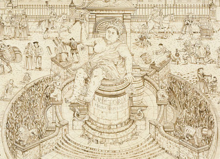 | ADAM DANT Dant on Drink: Drawings about Drinking in Britain Private view: 24 November, 6-9pm 25 November - 8 January 2011 Hales Gallery is pleased to announce Adam Dant's second solo show at the gallery, Dant on Drink: Drawings about Drinking in Britain. Dant makes lavish and richly layered drawings which take the viewer on an inventive and imaginative visual journey. His subjects are always meticulously researched and the resulting works take many forms including maps, charts and visual allegories. The elaborate scenes he depicts are often located in recognisable spaces, places and institutions. In four large narrative tableaux, Dant depicts the politics, language, history and environment of the nation's very particular relationship with 'the bottle', exploring the way in which the news media use representations of contemporary 'Binge Drinking Britain' as a convenient vessel to be filled with the wider themes of social improvement and change, political progress and the general health of the nation. The seemingly dense and sprawling visual narrative of Dant's work often belies the carefully considered structure beneath. A flowchart linking the various historical figures and drinks logos in his drawing, The Fight between Temperance and Liquor, underpins this boisterous scene much in the same way that generations of received ideas, common history and hidden national neuroses may well lie beneath the media's image of 'Binge Britain'. The Fight between Temperance and Liquor also transforms and modifies its real location, Walsall Town Centre, in such a manner that the whole scene becomes a contemporary reworking of Bruegel's 1559 painting The Battle between Carnival and Lent. Amongst recognisable landmarks such as the statue of 'Sister Dora' and the town's much loved hippo sculpture, birds, beasts and characters from alcoholic drinks labels battle with the protagonists of the temperance movement. A flock of 'Famous Grouse' boldly peck away at 'The Band of Hope' whilst the 'Babycham' bambi cruelly de-bags Margaret Bright-Lucas (1818-1890), president of 'The British Women's Temperance Association'. The sepia ink drawing British Drinking depicts the chaotic and Bruegelesque 'booze-fests' that regularly take place on the streets outside the artist's studio in Shoreditch, London. Whilst showing all variety of excess and diversion, this panorama of inebriation constitutes an extensive glossary of figures of speech used to describe states of drunkenness. Revelers are depicted literally 'trolleyed', 'trashed' and 'snookered' whilst others enact more antiquated synonyms as with the gentleman who has 'seen the French King' or another who is 'bit by a barn weasel'. Royal Drinking catalogues the traditional attachment of the British royal line to alcohol. A grand procession passes before a view of Buckingham Palace draped with the logos of the many drinks brands who boast royal approval. The parade stretches from William the Conqueror and his alcohol only diet to the young princes, William and Harry, and their preferred tipple, the 'the crack baby' cocktail. The parade of bibulous monarchs wends its way around a fountain filled with 'empties' overseen by a statue of Queen Victoria who is depicted as an enormous female Bacchus. The title of the drawing Bread and Circuses refers to the Ancient Roman political tool whereby the common man is made passive and unaware of his civic duty by the 'consolations' of both. The pitched auditorium of the coliseum contains a chronology of British repositories of alcoholic drink from Tavern to Tesco. Unlike the other 3 drawings in this overview of British drinking culture, the arena here is empty of drinkers suggesting prohibition, the aftermath of some form of booze apocalypse or that the joyful and wanton transience offered by the hop and the grape will be eternally providing of a fleeting escape from the rubble of history. Dant's drawings can be found in numerous public and private collections including The Arts Council Collection, Tate, The V&A;, MoMA, New York, Deutsche Bank, The Museum of London, The Government Art Collection, The Musee d'Art Contemporain, Lyon and San Diego Museum of Art. A 56 page illustrated catalogue 'Dant on Drink', published by The New Art Gallery Walsall will be available at the gallery during the show. For further information and images please visit www.halesgallery.com or contact Hales Gallery on 0044 (0)20 7033 1938 or [email protected]. | ||||
