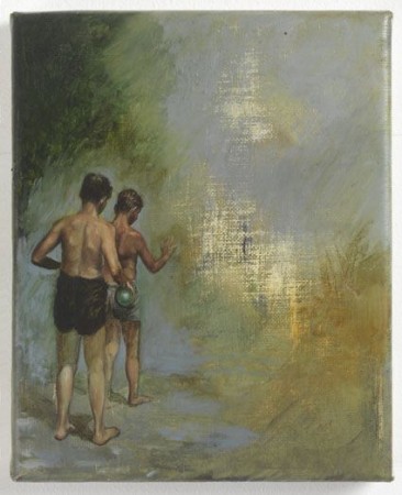 The works in this exhibition sit cryptically with each other without expressing any common theme. Instead they relate to previous paintings by the artist, finding aesthetic links between uncommon subjects. The arrangement of round black berries of a plant, for instance, recalls the three-dimensional models of chemical elements that are studied by the protagonists of his earlier paintings. In another painting, two boys walk tentatively into an abstracted world of paint that represents a more elemental version of the Romantic abysses skirted by Orr�s previous heroes. One of the boys clutches a translucent sphere in his hand as though it offers spiritual guidance for the journey ahead. Spheres crop up again and again in Orr�s works as objects of fascination and wonder. Their meaning is elusive to viewers of the work, a symbol of a world that lies beyond their grasp.