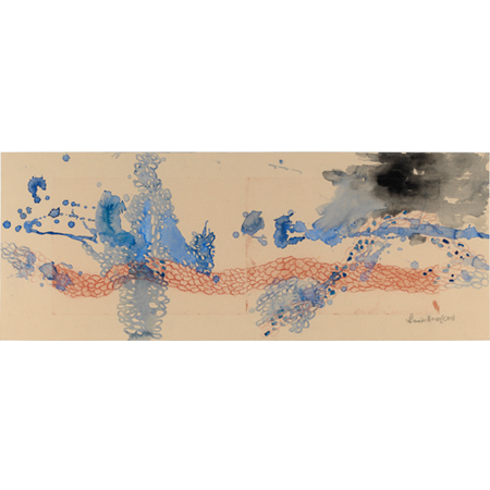 In all of Bourgeois�s works, colours and motifs are imbued with emotional meaning. Blue represents peace, meditation and escape; black its opposite; and red blood and insistence. The gentleness of the title is borne out through imagery. Pencil-drawn horizontal lines traverse the sheets like the staves that mark music paper, a device that also features in the portfolio work Nothing to Remember (2004 � 6) and of which Bourgeois has explained: 'it is very peaceful to look at the lines of the staff paper. It gives a rhythm�. it gives a passive direction to the horizontal plane and it gives an active direction to the vertical plane.' Often the meandering course of a river is described as hundreds of corpuscular forms, strongly suggesting the vessels of the body. These relate to the 'cumuls', cloud-like shapes that have been a recurrent feature in Bourgeois�s work since the late 1960s that she values for instilling a sense of reassurance and calm. Lines, flowing through all of La Rivi�re Gentille, are themselves a source of comfort: �The repetitive motion of a line, to caress an object, the licking of wounds, the back and forth of a shuttle, the endless repetition of waves, rocking a person to sleep, cleansing someone you like, an endless gesture of love.�