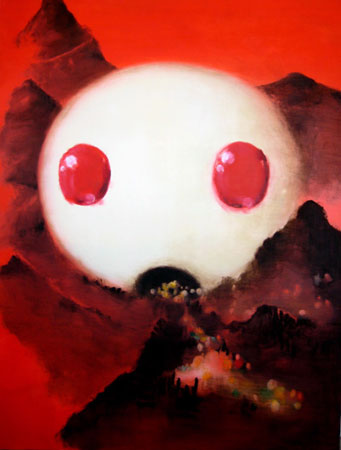 Mie Yim�s fantastical paintings of mutated characters shape and dominate their own strange terrain. Images teeter between the vacant faces of plush children�s toys and expansive, cavernous landscapes. The large scale of Arrival and Lonesome Rock elevate these characters to an almost heroic stature.