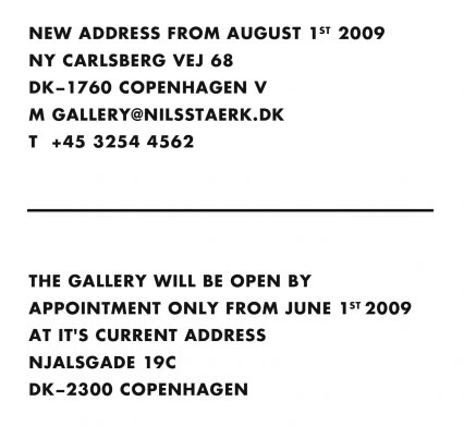 | | | NILS STAERK CONTEMPORARY ART: SUMMER NEWS 2009 - 1 June 2009 to 1 Sept 2009 Current Exhibition | 1 June 2009 to 1 Sept 2009 open: tue-fri: 12-17 sat: 12-15 | Nils St�rk Contemporary Art Njalsgade 19C 2300 Copenhagen Denmark Europe p: +45 3254 4562 m: f: w: www.nilsstaerk.dk