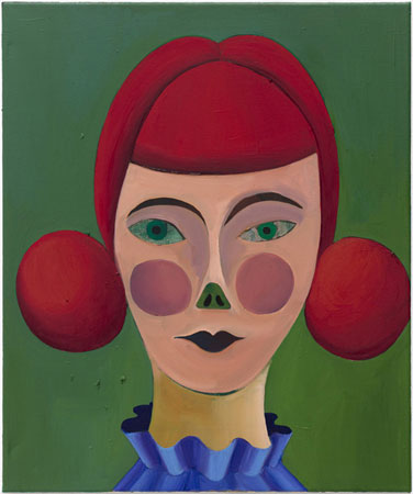 To the question of what the exhibition is about, the title of the exhibition Falsche Figuration gives some if not all of the clues. Ruckh�berle leads us down a road full of strange turns and blind alleys. The men and women of the paintings appear both fully formed and strangely flat. Embedded in the surface the figures are simultaneously pushed towards the viewer, a feature accentuated by backgrounds that are either of a solid colour or a mesmerizing array of patterns. A series of masks fill up this double position particularly well. Rather than giving away the faces behind, the eyes and mouths wide-open become part of the winding symmetric design of masks themselves. It is fake figuration not only in the sense that the artist creates impossible constellations but also questions a world teetering between pattern and reality.