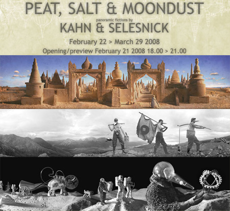 | Kahn and Selesnick : From Image to Story Defying easy classification, the work of Kahn/Selesnick --artists Richard Selesnick and Nicholas Kahn-- incorporates photography, painting, sculpture, design, and narrative text. With diverse influences including Italian Renaissance painting, 19th century panoramas, and Sufi tales among them, their images are very complex while graphically elegant, and in dialogue with various traditions of written and visual narrative. The viewer of their elaborate and fantastic scenes may decode the images symbolically and decipher the accompanying texts, yet still remain seduced by an enigma. The Englishmen Kahn and Selesnick � both born in 1964 � have been collaborating since 1988 : first creating installations combining painted portraits on plaster panels and bread, honey, and wax sculptures displayed in wooden ritual architecture. Tired of working locked up in a studio, they returned to photography on location, experimenting with 360-degree panoramic photographs set in the English countryside, and eventually integrating costumes and sets in vast productions rife with curious anachronisms. In 1996, their first large exhibition of photographic panoramas, The Flight Series, was a body of work that brought to fruition the various components that would become the team�s primary modus operandi: story and history intertwined to weave a personal mythology, accompanied by museological display of found and fabricated artifacts and archives. The Flight Series recounts the story of a fictional expeditionary brotherhood, the Royal Excavation Corps; its visual "documentation" depicted on sepia-toned panoramas appears historically accurate for the era in which the R.E.C. was said to have been active, the 1930s. The exhibition also included two R.E.C. gliders allegedly used in aerial reconnaissance. 1999�s The Circular River, the R.E.C. Siberian Expedition of 1945-46, continued the story of the R.E.C. begun in The Flight Series. Objects purportedly loaned by the Novosibirsk Museum of Ethnography accompanied the show of artificially-aged laser-print panoramas. In this series Kahn and Selesnick made more apparent the latent mysticism present in the first R.E.C. series, depicting a blend of traditional and invented shamanic imagery as the R.E.C encounter Siberian natives, quietly illuminating the R.E.C.�s general activities of flight and exploration as allied with classical shamanic themes such as the soul�s travel between worlds; at the same time, humour is omnipresent, with Russian scientists claiming to have dug up a mammoth and persuading the English to abandon their mission, at least temporarily, in favor of vodka-drinking. Created in 2000, the series Scotlandfuturebog marks a major shift: the artists use, for the first time, digitally-combined 4 x 5 film shot on location on the Isle of Skye, Scotland; the Beara Peninsula, Ireland; and Cape Cod, US. The black and white images have a new bleakness that echoes the post-apocalyptic scenes they represent: in desolate mountains and bogs, a mysterious population of ambiguous temporality, primitive and futuristic all at once, seems to have survived a disaster. Portraits and allegorical scenes are accompanied by a cryptic text that alludes more than it elucidates. In response to the black and white of Scotlandfuturebog is the colour of City of Salt (2001), in tones that, like the sepia of the R.E.C. series, recall an archaic photographic process, early color from the origins of photography. If the sets and costumes remind us of the Orientalists of the 19th century, the texts by the artists and Sarah Falkner and Erez Lieberman � parables on power, spiritual inquiry, and ethical dilemmas � find an echo with the current uneasy relationships between East and West. The eponymous city made of salt is depicted by means of a complex ceramic model. The Apollo Prophecies (2004), is perhaps the artists� most ambitious project in terms of staging: created in collaboration with students at Toni Morrison�s Atelier Program at Princeton University, the project necessitated the building of complex sets and props, and the creation of original costume. In a narrative style directly inspired from the cycle painted by Masaccio for the Brancacci chapel, the panoramas - shot for the first time entirely digitally � and the accompanying text describe the landing on the Moon, in the 1960s, by astronauts and cosmonauts, and their encounter with members of another expedition from Earth that had arrived at the beginning of the 20th century. Kahn/Selesnick are included in numerous public and private collections in the United States and in Europe. A number of their major projects have spawned book projects specially-designed by the artists in keeping with the aesthetics and concepts particular to each project. The exhibition at Aeroplastics Gallery is a rare opportunity to experience the totality of a complex vision and its elaborate manifestations. P-Y Desaive Kahn et Selesnick�: de l�image au r�cit Inclassable, l��uvre de Richard Selesnick et Nicholas Kahn se situe � la crois�e de la photographie, de la peinture, de la sculpture et de l�ing�nierie, le tout nourri d�influences h�rit�es de la Renaissance italienne ou de la tradition des panoramiques g�ants du XIX�me si�cle. D�une grande complexit� formelle bien que d�pouill�es, leurs images sont les chapitres de r�cits qui empruntent � la tradition du conte oriental. L�analogie avec la litt�rature ne s�arr�te pas l�, car l��crit est chez eux indissociable du visuel�: le spectateur choisit de s�inventer une histoire au contact des sc�nes fantastiques, ou se plonge dans la lecture des textes denses qui r�v�le la cl� de l�histoire � sans jamais rien �ter au myst�re de l�image. La collaboration des Anglais Kahn & Selesnick � n�s tous deux en 1964 � remonte � 1988�: ils con�oivent alors de vastes instal