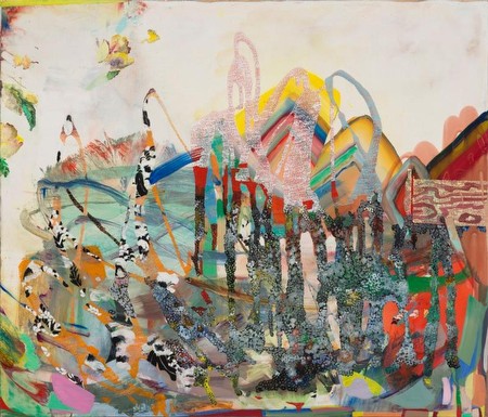 | Carolyn Case: "Heat and Dust" March 19 - April 18, 2015 Opening Reception: Thursday March 19, 6 - 8 pm Asya Geisberg Gallery is pleased to present Heat and Dust, an exhibition of paintings by Carolyn Case. This will be the artist's first solo exhibition in New York. In her new series, Case's sojourns in the dusty urban environs of Tehran became the catalyst for a modified palette and conceptualization of space. Typified in the early work of Phillip Allen, Case's schizophrenic counterpoints conjure ambiguous, implausible landscapes where suggestive objects conflate with eruptions of sprawling painterly debris. Like the Hubble telescope capturing our galaxy piece-by-piece, Case suggests an extravagant world outside of the picture plane. Divergent fields both coexist and contend, creating an elaborate multiverse within each painting. Dense areas spill over the panel edges, or are pushed back by abstractions seeping in, connoting vast realms curbed by the artist's fragmented disclosure. Case's experience of the Iranian landscape resonates frequently within these new works. Throughout the city of Tehran, decaying architecture and objects both quotidian and revered coalesce under a perpetual cloaking of dust. For Case, this provides a visual homogeneity and intellectual unification for foreign bodies, shapes and forms, which the artist interweaves into each painting, allowing for more awkward bedfellows and intrepid juxtapositions. The patchwork walls of Tehran display a mélange of glaring inconsistencies, with mismatched colors, materials and finishes. Repaired brickwork frequently consumes areas of graffiti, leaving a vacuity between words, gesture and color. This mashed-up restoration becomes a poignant metaphor for painting itself, most evident in works such as "Wishful Building", where a reluctant melding of gesture and semi-erased form evokes a decaying archway, exposing a serene rubicund horizon beyond. Previous references to religious iconography, Andean textiles, and miniature painting remain, but are now broken apart and recombined with a shrewd eye and erudite methodology. In "Starfish Energy", Case fires on all cylinders, creating a jarring synchronicity of references. Drawing our eye back to the center of the panel, a matrix of multifarious dots, leaching pigmentation, and sequential line-work lie suspended within a complex network of limpid rivulets, loosely obscuring the impasto brushwork underneath. Rainbow waves suggesting mineral matter lie at the tip of the crescendo, crowning a cascade of liquid strokes that superficially veil a space of questionable depth below. Here, Case stifles at least a third of the picture plane, where one could be mistaken for conjuring the shape of a tulip from ephemeral clumps of brushwork. These areas of bleakness reverberate with as much intensity as the raging cacophony below, highlighting further the signature heterogeneity with which the artist wields her brush. Originally from California, Carolyn Case earned her MFA from MICA's Mount Royal School of Art in Baltimore, MD, and her BFA from California State University in Long Beach, CA. She has shown throughout the Mid-Atlantic area, with solo exhibitions at Loyola University, McLean Projects for the Arts, and the Art Registry in Washington D.C. She has also participated in two-person and group exhibitions at Joyce Goldstein Gallery, Chatham, NY, Reynolds Gallery, Richmond, VA, John Fonda Gallery, Baltimore, MD, and the Delaware Museum of Art, Wilmington, DE. Residencies include the School 33 Art Center in Baltimore, the Vermont Studio Center, the Kanoria Centre for the Arts in Ahmedabad, India, and most recently a full fellowship at the Virginia Center for the Creative Arts. Case's works are featured in the Spring 2013 New American Paintings, and have been reviewed in the Baltimore Sun. | ||||