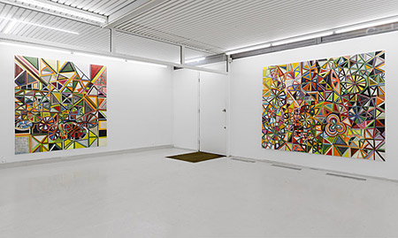 | DAISY DIAMOND ANNA S�RENSEN With the exhibition DAISY DIAMOND, Anna S�rensen once again fills the walls of Gallery Tom Christoffersen. In the new paintings, the artist continues her wrestle with the abstract colouristic mode, which has resulted in a series of dynamic, intense and inviting paintings. Again, coulour and forms play the leading roles on the big canvases, while there is an increased concentration in the still more complex compositions. The paintings are constructed in a democratic order with encounters as the central focus � the meeting between lines, forms and colours. Space is suspended and everything is drawn forward in balanced, lyrical compositions, where you seem to find yourself in either an aerial view or with the detail close up in a sort of mechanical structure. The striking colour range in the paintings creates an enchanting harmony, in which dark and heavy 70s� tones are safely mixed with fluorescent 80s� neon. Anna S�rensen�s paintings are like frozen moments, where a controlled chaos of organic and geometric forms are held together by the square shape of the canvas. If you were to shake the frame, one could imagine the painting�s elements being pushed around between one another in order to melt into a new whole by falling into shape. Anna S�rensen keeps her art in play and creates paintings in a serial process � every new painting is created by the pillars of a visual vocabulary that seems to come from a kaleidoscope run wild. Anna S�rensen (born 1968) graduated from the Royal Academy of Fine Arts in 1996 and has been at Gallery Tom Christensen since 2002. DAISY DIAMOND is her fourth solo exhibition at the gallery. Anna S�rensen has participated in several group exhibitions and last year also had the solo exhibition COLOUR GROOVE at Holstebro Kunstmuseum. She lives and works in Copenhagen. | ||||