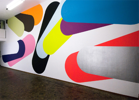 | Jan van der Ploeg : Good & Plenty Saturday, November 7th to Saturday, December 19th, 2009 Met de tentoonstelling Good & Plenty vieren we het verschijnen van de catalogus Wall Paintings 2005 - 2009. De nieuwe catalogus bevat een uitgebreid overzicht van muurschilderingen die Jan van der Ploeg uitvoerde voor priv�collecties, openbare ruimten, galeries en bedrijven in de afgelopen vijf jaar. Voor Good & Plenty ontwierp Van der Ploeg een monumentale muurschildering op de grote wand in de galerie. Ook is er een selectie te zien van maquettes van muurschilderingen die Van der Ploeg in opdracht maakte. Daarnaast een selectie schilderijen en een speciaal voor de gelegenheid gemaakte zeefdruk in een oplage van 35. Jan van der Ploeg begon met het maken van muurschilderingen in zijn herkenbare geometrische ontwerpen in zijn woonplaats Amsterdam. Sindsdien schilderde hij zijn motieven in honderden gelegenheden zoals galeries, kunstverenigingen, bedrijven en bij particulieren over de gehele wereld. Hij gebruikt verschillende combinaties van eenvoudige vormen, harde kleuren en in verschillende maatvoeringen. Zijn werk daagt de kijker uit de ruimte op een nieuwe en dynamische manier te ervaren. Jan van der Ploeg is geboren in 1959 te Amsterdam waar hij woont en werkt. Hij studeerde aan de Rijks academie te Amsterdam en in London aan het Croydon College of Art. Recent had hij solotentoonstellingen in het Hammer Museum in Los Angeles, House of Art in Budweis in Tsjechi�, Museum Boijmans van Beuningen in Rotterdam en het Gemeentemuseum in Den Haag. In 2010 staat een duo tentoonstelling op het programma met Thom Puckey in Centro del l'arte contemporanea te Prato in Itali�. JAN VAN DER PLOEG And yet Giotto succeeded. He could make the local and particular stand for universal ideas. Roger Fry, Vision and Design (1920) The purpose of good design is to ornament existence, not to substitute it. George Nelson, �Good Design: What is it for? Problems of Design (1957) Q: Ought [art and design] tend toward the ephemeral or toward permanence? A: Those needs and designs that have a more universal quality will tend toward permanence. Charles Eames, �What is Design?� (1972) American artist Joe Scanlan wrote a critical essay in 2001 titled, Please, Eat the Daisies. In it he examines the faulty premise of �design art,� a term that came into favor in the mid 1990s� as a way to categorize the work of artists such as Jorge Pardo, Atelier van Lieshout, Tobias Rehberger, Andrea Zittel among many others. He describes it by stating that, �design art could be defined loosely as any artwork that attempts to play with the place, function, and style of art by commingling it with architecture, furniture and graphic design.� Importantly he goes on to say that, �what seems critical to design art in all of its forms is that some sort of slippage occur between where art is, how it looks, and what it does.� The premise of this essay however is not Scanlan�s astute ability to detail the characteristics of this new genre but his insights into exposing its failures. His fundamental argument is that its practitioners evoke double standards by employing notions of design and function as a foil for artmaking. �We harbour a philosophical disappointment in the professional double standard practiced by design artists themselves, whose need for art to appear useful�without the risk of being so�strikes us as timid and sad.� I appreciate Scanlan�s articulate assertion that design art regularly fails because its claim to design, and all of its many social and serviceable facets, is only a ruse for making art. This is where Jan van der Ploeg comes in. His wall paintings conjured from the visual properties prevalent in graphic design aspire to be first and foremost art. Van der Ploeg is a skilled designer and exquisite draftsman who navigates between innovation and familiarity, mischievousness and pragmatism. As a problem solver Van der Ploeg assesses a given site, public or private, and with a refined abstract vocabulary he dramatizes architecture and place. Organizing information and assigning it active meaning is a role shared by both the artist and the designer. Yet distinct from the graphic arts, van der Ploeg conveys, like Giotto before him, a desire to communicate abstractions and ideals that lay beyond function kindling the extra-ordinary and the unexpected. With color, repetition and scale, van der Ploeg eschews static functional design dialogue, opting instead for lively visual attention. One needs to approach his wall paintings with the same curiosity that one would approach a Sol LeWitt wall drawing or an Ellsworth Kelly shaped painting. Despite their graphic and generous scale, close and intense observation is required to understand the visual patterns and motifs comprising their composition. As Philip Fisher writes in Wonder, the Rainbow and the Rare Experience, �To profit from wonder man cannot be either inattentive or passive, since in these cases he would not notice differences, nor can he feel himself to be living in a world that is fragmented, anarchic, and unpredictable.� Van der Ploeg works here, in the margin that separates the familiar from the wondrous, between abstract and the concrete This is perhaps most evident in the ambiguous and idiosyncratic public spaces van der Ploeg occupies: the stairwell, the corridor, the oblique street-side wall of a house. These are spaces of transition, ephemeral spaces, overlaid with a design that, through a self-contained symmetry, or a repetition suspended by the space itself, attests to its own permanence, its own structurality. As Friederike Nymphius writes, van der Ploeg�s wall paintings, �draw in� the incidental marks of utility, the purely �architectural factors like doors and windows, chimneys and frames,� negating their particularity and making them complicit in the monochrome abstraction. This is something quite different from, perh