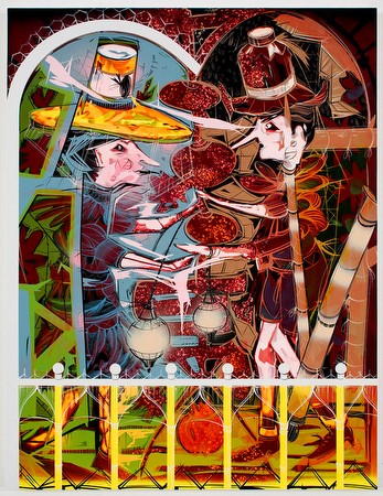 | Lari Pittman Irrevocable Opening reception:April 27, 2012, 7 – 9 pm Exhibition duration:April 27 – June 30, 2012 Gerhardsen Gerner is very pleased to announce an exhibition with new works by the American painter Lari Pittman, on occasion of the GALLERY WEEKEND BERLIN 2012. Lari Pittman pursued painting at CalArts in the 1970s, when virtually everyone else was turning away from the medium. At times his particular brand of painting – which has always borrowed in equal measure from decoration and high art – has appeared positively visionary, it was so far beyond the mainstream. Now, as a younger generation of painters has come under his influence, he appears more an artist ahead of his time. It is possible to look back through Pittman’s output and see general trends. But it is difficult to separate out distinct periods. Just when did his figures start to layer and almost merge, losing the collagelike feel of some earlier work? And when have his paintings, which so openly relate to sex and repression, given way to lush compositions flowing frenzied across the canvas, yet still remaining but a clearly defined part of the visible? Certain motifs, such as the balloonlike heads and disembodied dancing legs, have occurred for decades, while others might develop in a few series, then disappear only to reemerge years later. In Pittman’s view, it is all of a piece. “For me, painting is a continuous practice,” he says. “It is a language you build up over time.” Rather than a rational narrative, a Pittman painting delivers a heady mix of allusions and chains of references. When preparing for a new show, he begins by thinking of loose themes that both distinguish the new paintings and connect them to previous bodies of work. “I have always used a very formal structuring of the event in a space,” says the artist. “In these works it is a sort of proscenium.” For this year’s Gallery Weekend in Berlin, Gerhardsen Gerner will be showing four new larger paintings on canvas and ten small paintings by Lari Pittman.In these new works, the floral, yellow and pink shapes of the earlier series of works for Gerhardsen Gerner are still to be found, albeit now hidden in the background and in deeper layers of the images.The new canvases are structured by squarish elements of colour. In two of the paintings they have been applied over the layers beneath in grids or diamond-shapes. In "A transcendent mutability produced by camouflage" they are finally combined into rectangles in their own right – a figure almost merging with the background carries one of them under the arms: a nod to the structuring element of this series. Central focus of the exhibition is the painting "The making of a Boy (1952)". Branching tubes extend across the picture surface and are flowing into colourful jars. On another layer above, four profile views in white oval frames have been placed, which are connected to each other and to the vessel at the centre by clearly defined lines. Two nest-like picture elements are positioned near the two topmost portraits. Like the passage of time bringing forth stories and legends for centuries, the composition is reminiscent of a family tree with its interwoven feather- and thistle-like structures flowing into each other and blurring. Lari Pittman lives and works in Los Angeles. He can look back on a long and successful artistic carrier and he also teaches drawing and painting at the University of California, Los Angeles (UCLA). In addition to many acclaimed international exhibitions, his work has been shown in Germany at the Kunstmuseum Wolfsburg and ZKM in Karlsruhe. Lari Pittman is represented in the renowned Goetz Collection in Munich and his works are also included in the following collections:Akron Museum of Art, Akron; Eli Broad Family Foundation, Los Angeles; Carnegie Institute of Art, Pittsburgh; Corcoran Museum of Art, Washington; Chapman University, Orange; Fondazione; Sandretto Re Rebaudengo, Torino; Los Angeles County Museum of Art, Los Angeles; Museum of Contemporary Art, Chicago; Museum of Contemporary Art, Los Angeles; Museum of Contemporary Art, Monterrey; Museum of Modern Art, New York; Newport Harbor Art Museum, Newport Beach; Peter Norton Family Foundation, Santa Monica; Phoenix Museum of Art, Phoenix; San Francisco Museum of Modern Art, San Francisco; Sheldon Memorial Art Gallery, Lincoln; Stedelijk Museum, Amsterdam; Weatherspoon Art Gallery, The University of North Carolina; The Whitney Museum of American Art, New York. Lari Pittman Irrevocable Eröffnung:27. April 2012, 19 – 21 Uhr Ausstellungsdauer:27. April – 30. Juni 2012 Gerhardsen Gerner ist sehr erfreut, eine Ausstellung mit neuen Arbeiten des amerikanischen Künstlers Lari Pittman anlässlich des GALLERY WEEKEND BERLINs 2012 zu präsentieren. Lari Pittman belegte das Fach Malerei an der CalArts in den 1970ern, als andere Mitstudenten sich von diesem Medium abwandten. Bisweilen erschien sein besonderer Malstil – der sich immer zu gleichen Teilen auf die Dekoration und die hohen Künste bezog – auf positive Weise visionär: er war einfach so weit weg vom Mainstream. Mittlerweile beeinflusst der Altmeister eine neue Generation von Malern und erscheint als Künstler, der seiner Zeit ein Stück voraus ist. Schaut man auf Pittmans Oeuvre zurück, so sind allgemeine Entwicklungstendenzen zu erkennen, jedoch lassen sich klar umrissene Schaffensperioden nicht einfach herauskristallisieren. Wann begannen sich seine Bildelemente übereinanderzuschichten, beziehungsweise nahezu ineinander überzugehen, und so das Collagenhafte der früheren Werke hinter sich zu lassen? Und wann haben seine, sich offen auf Sex und Repression beziehenden Malereien, üppigen Kompositionen Raum gemacht, die sich rauschartig über die Leinwand ergießen, aber trotzdem immer nur ein klar umrissener Teil des Sichtbaren bleiben? Bestimmte Motive, zum Beispiel die ballonartigen Köpfe und Gebilde oder die vom Körper separie