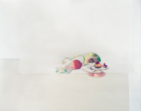 In Untitled #3 (above), reproductions of an orange in a net and a slice of honeydew are placed next to the reproduced image of a platter, on top of which is set an actual half-eaten peach. A reproduction of a curling melon rind and mysterious, flattened swaths of color mingle with these objects. The whole arrangement is set on a white paper, atop a table against the studio wall. The juxtaposition of three-dimensional objects alongside their reproductions conceptually defuses the temporal urgency associated with vanitas. The tension here is rather the play between real and illusory space, and the puzzling implication of dimensionality on a flattened picture plane.